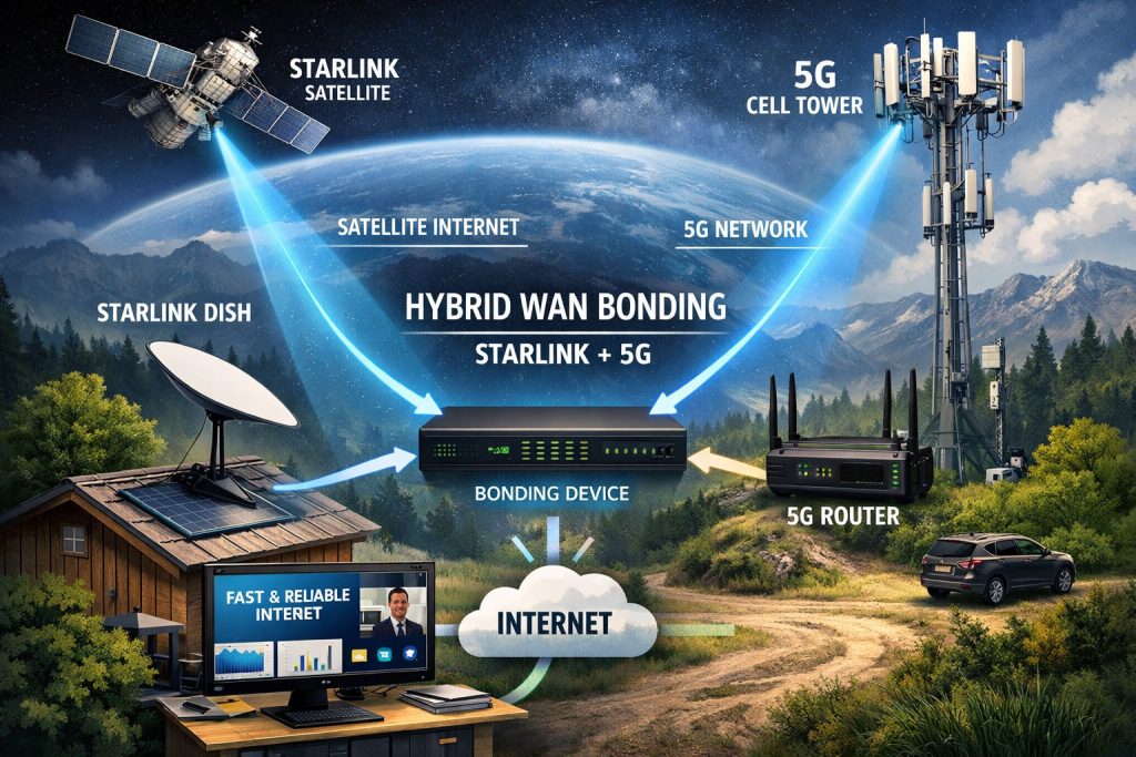 Hybrid WAN Bonding (Starlink + 5G) chuyên dụng là giải pháp kết hợp nhiều đường truyền internet (Starlink vệ tinh & 5G di động) thành một kết nối duy nhất, mạnh mẽ và ổn định hơn, gộp băng thông, tăng cường độ tin cậy, chống đứt mạng , sự kiện lưu động, hoặc ứng dụng cần kết nối liên tục như truyền phát trực tiếp (live streaming) .